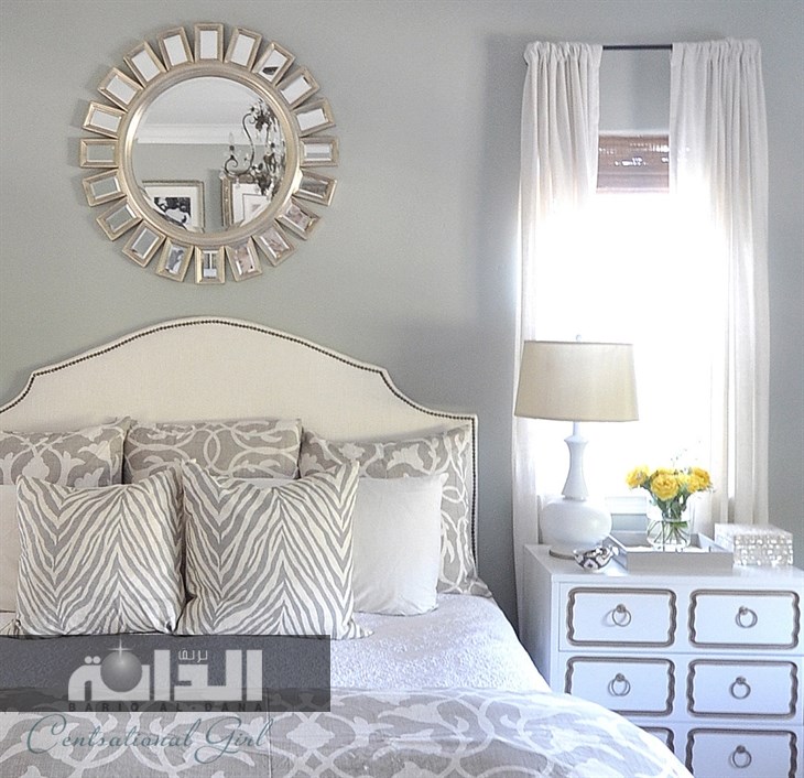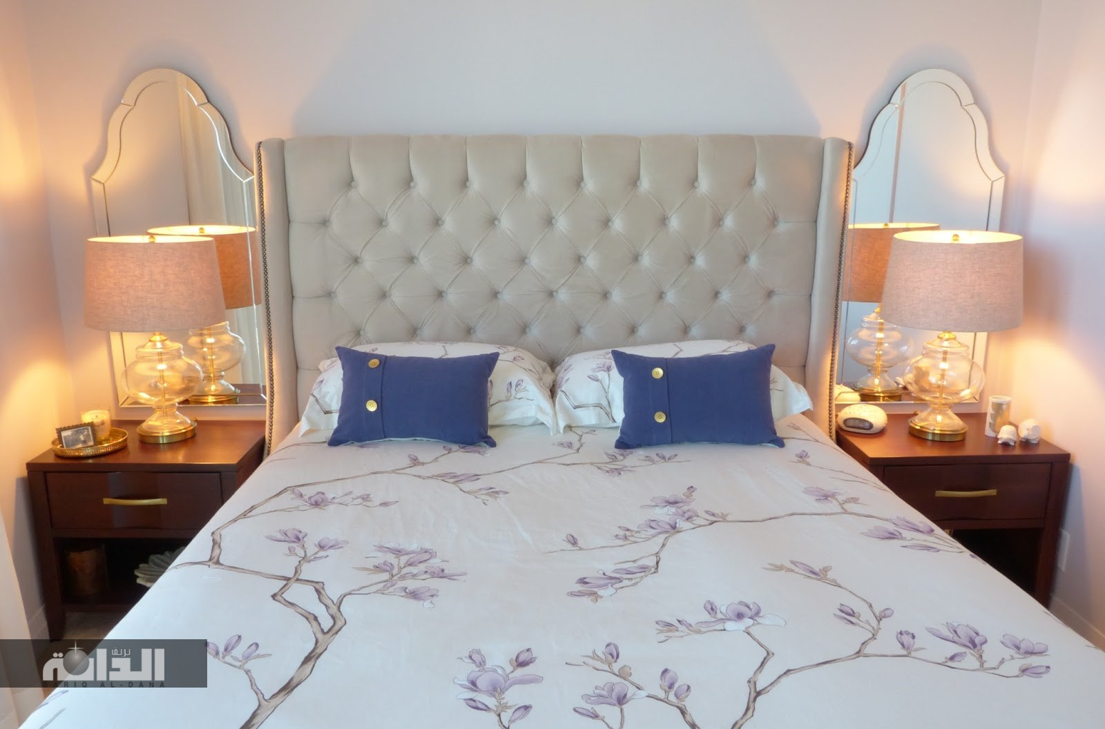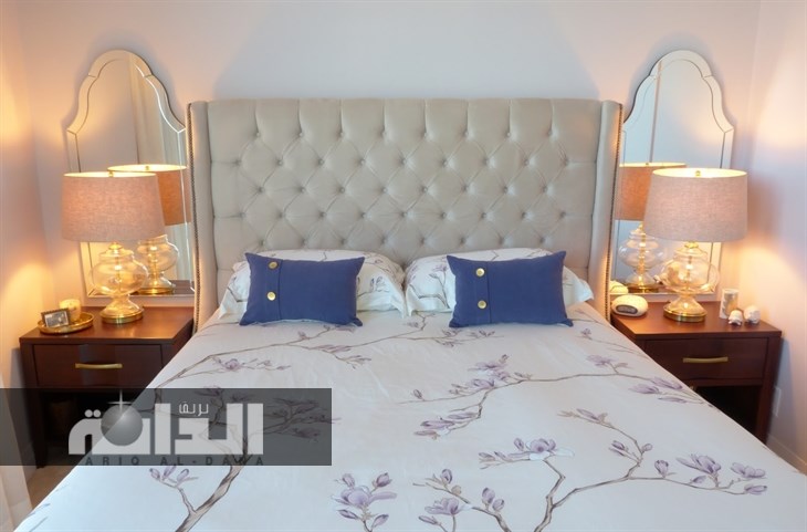 الفكرة من وضع عدة مرايا هنا هي تكثيف توهج الضوء المنبعث من الأباجورات في غرفة النوم . كما أنها تضفي لمسة رقيقة على الديكور .