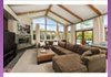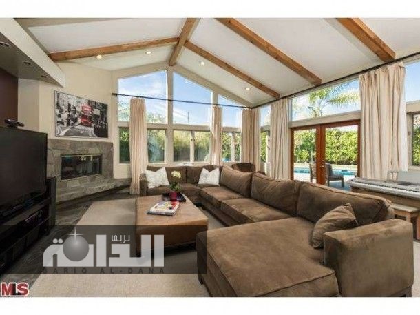 - غرفة المعيشة : اختارت إيميلي بعض الوسائد باللونين الأزرق والبني لتضفي نوعا من الدفء على غرفة المعيشة ذات اللون الأبيض . أما أكثر ما يميز الغرفة فهو الباب الممتد من الأرضية حتى السقف علاوة على المدفأة المزدوجة التي تطل أيضا على غرفة الطعام .